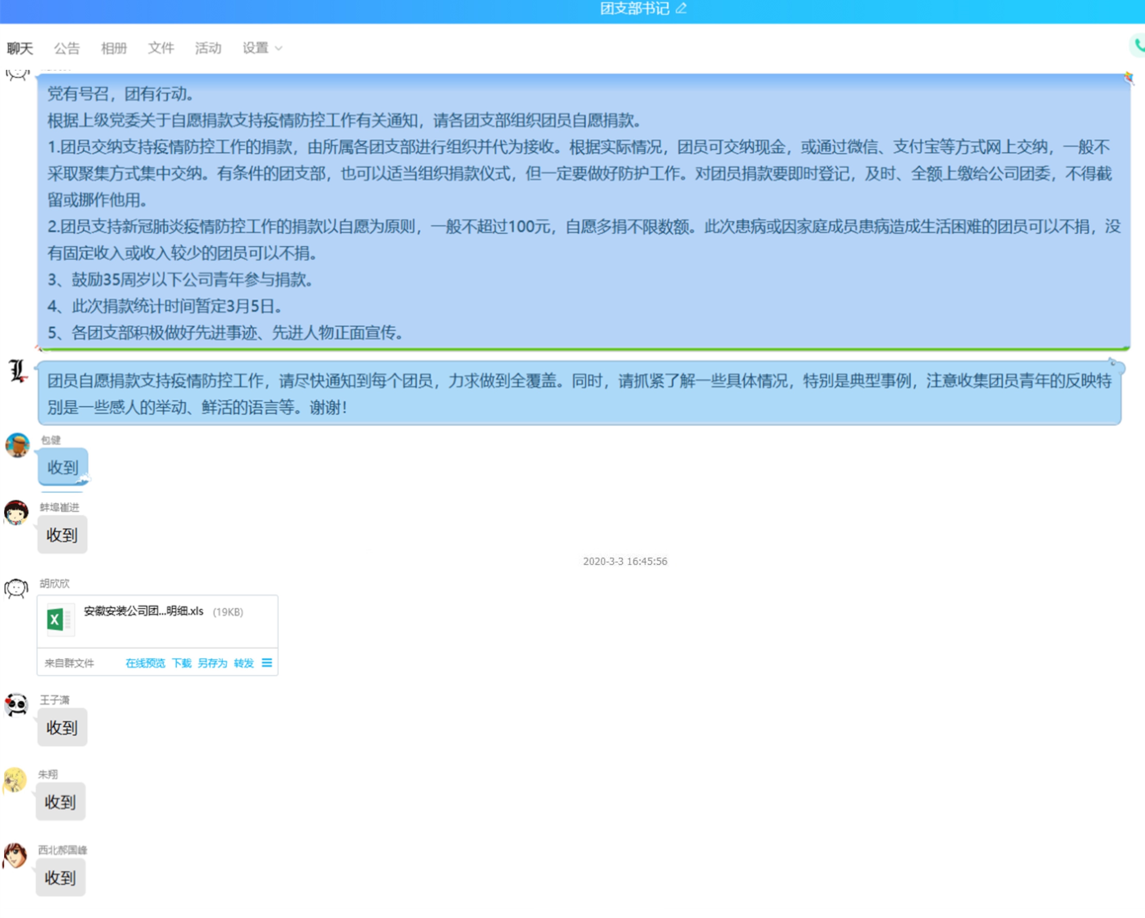 在這次疫情“抗戰”中,安徽安裝公司的團員青年們在各自的崗位堅守陣地,貢獻力量。各團支部書記帶頭“作戰”,有的積極配合社區進行防疫登記,有的堅守崗位做好公司防疫消毒工作,有的在項目一線積極進行防疫宣傳。各團員青年充分發揮生力軍作用,機關團支部徐君婷給社區捐獻了51個N95口罩,合肥團支部陳濤濤、馮俊、蚌埠分公司團支部王大旭等為公司想方設法采購防疫物資,西北分公司團支部劉金蓮給當地紅十字會捐款······他們以實際行動亮身份樹形象, 當好“戰斗員”,當好“宣傳員”,助力身邊的疫情防控工作,依法科學有序參與疫情聯防聯控。
