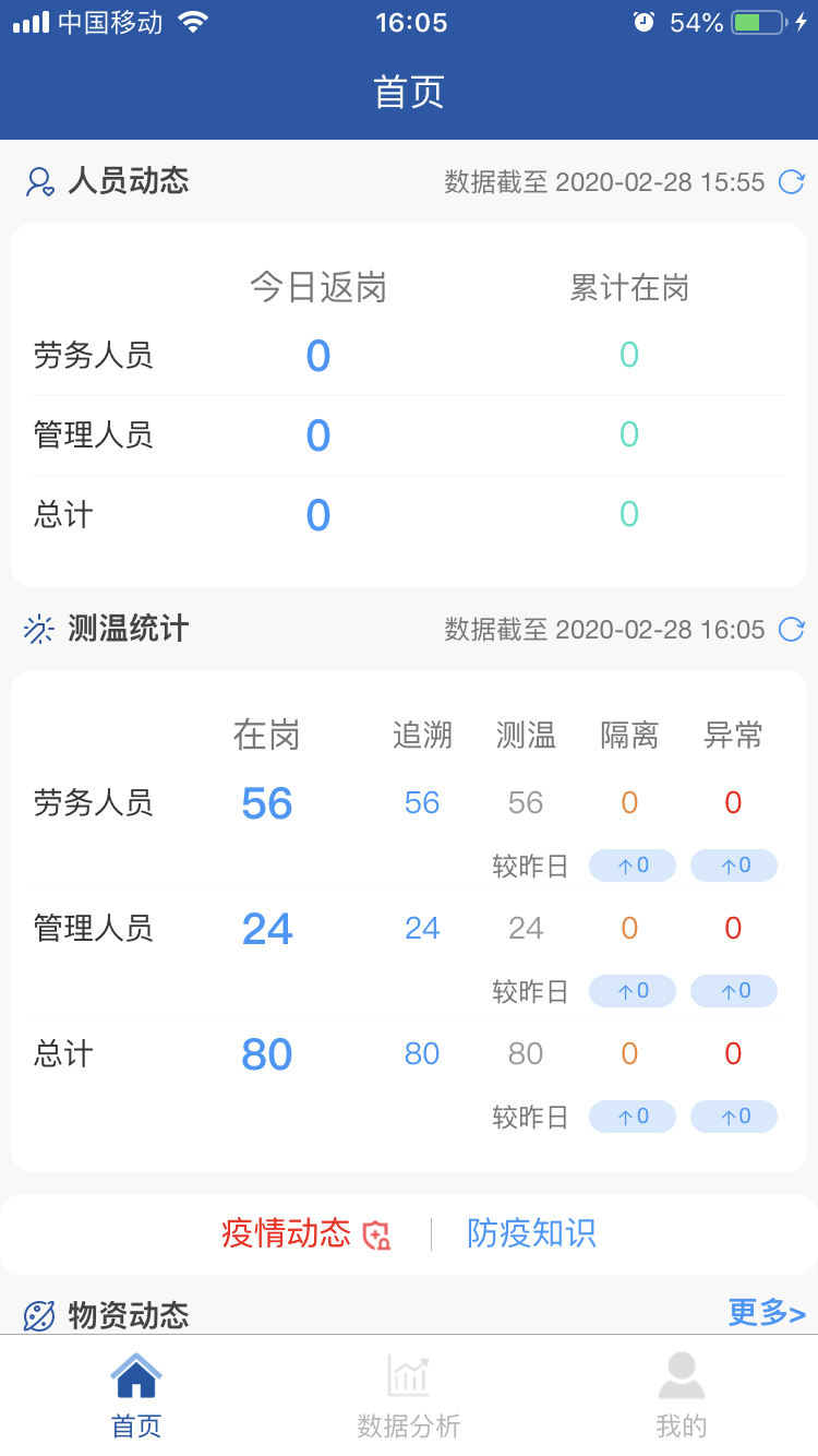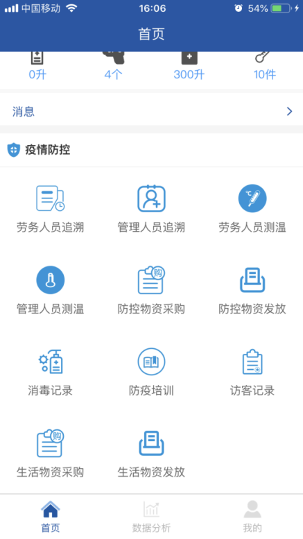 項目全面推行“返崗復(fù)工疫情防控系統(tǒng)”APP。主頁面包括勞務(wù)人員追溯、勞務(wù)人員測溫、防控物資采購、消毒記錄、疫情培訓(xùn)等11個專題版面,通過這些功能可線上及時填報人員返崗日期、體溫、癥狀及是否為留守人員等詳細信息,還有項目部的疫情物資采購情況、環(huán)境衛(wèi)生的消殺情況等相關(guān)信息,使上線人員時時了解疫情防控動態(tài),充分借助信息技術(shù)手段,全力打贏疫情防控“戰(zhàn)役”。 借助這一平臺確保項目部實時、準確、有效地掌握現(xiàn)場人員的健康情況,助力疫情防控工作。