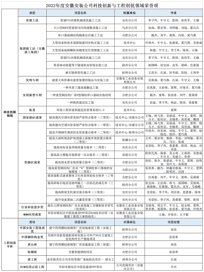 附:2022年度安徽安裝公司科技創(chuàng)新與工程創(chuàng)優(yōu)領(lǐng)域榮譽項