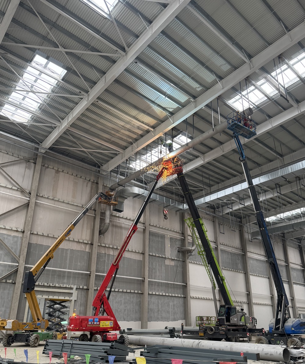 為確保施工有序高效運行,項目部嚴格按照總體工期計劃部署施工任務,加大人力、材料、機械投入,組織多個工作面同時展開施工,確保工程各節點進度有效推進。截至目前,沖壓車間架空循環水主管道已安裝完成進入介質間。車間一閣樓空調水主管安裝完成3600米,管道風機安裝65臺,組空安裝4臺,閣樓配電房移交3個,配電柜安裝90臺,橋架安裝1500米,電線電纜安裝10000余米,各種燈具安裝200盞,消防報警設備安裝160套。