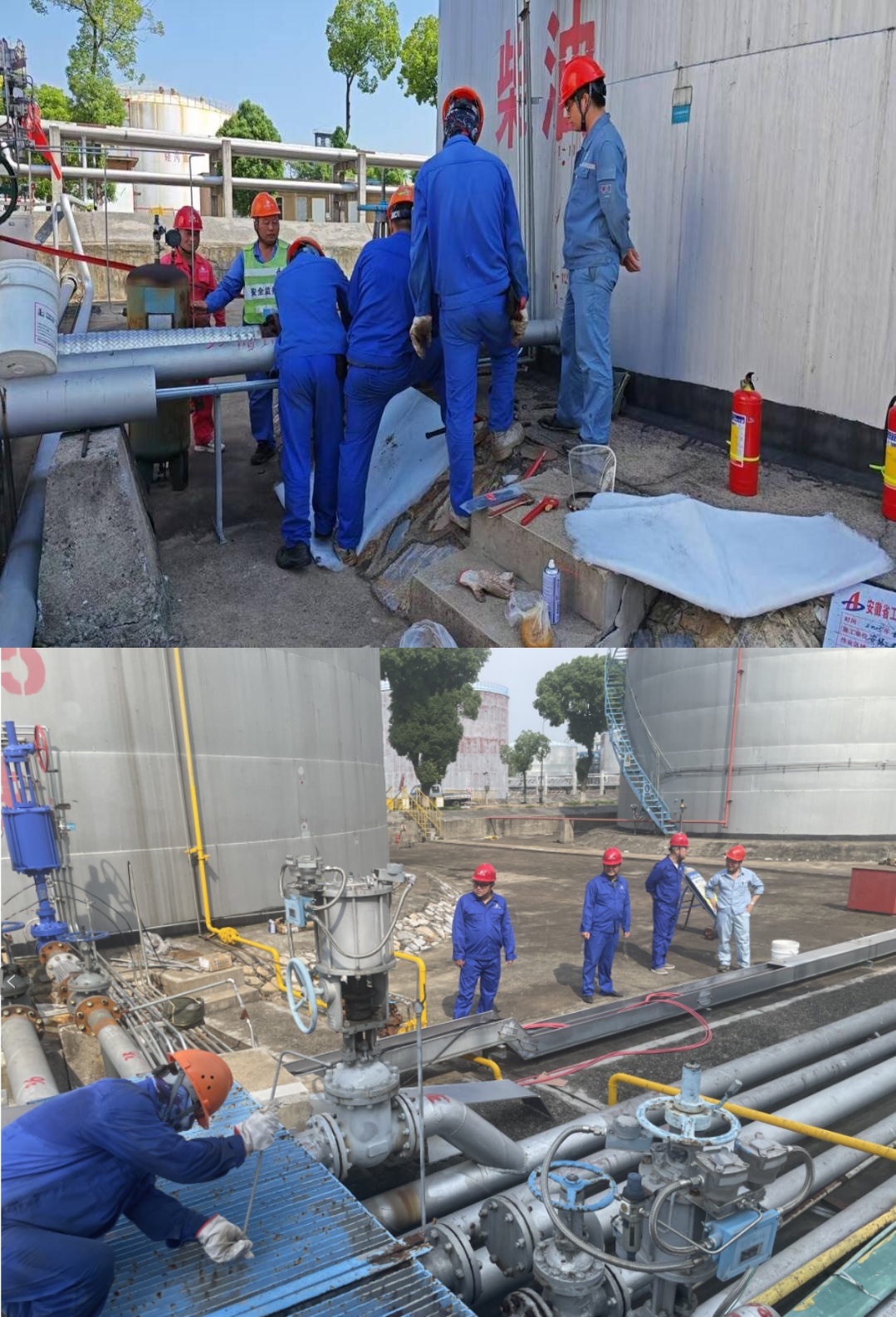 在培訓演練的同時,隱患排查工作也在同步扎實推進。市政公司聯(lián)合安慶石化儲運部、設備工程部及青島安工院,對框架協(xié)議項目進行現(xiàn)場專業(yè)指導聯(lián)合檢查。針對檢查出的安全隱患,及時下發(fā)整改通知單,各班組迅速響應、逐項整改并反饋,形成了隱患排查治理的閉環(huán)管理。隨后,市政公司黨支部充分發(fā)揮黨建引領(lǐng)作用,支委班子深入儲運部五、七等罐區(qū)進出口管線增設緊急切斷閥門等項目一線,與儲運部作業(yè)區(qū)領(lǐng)導圍繞項目安全管理深入研討,并實地檢查施工進度與安全防護措施落實情況,將黨建工作與安全生產(chǎn)深度融合,全力保障項目安全有序推進。